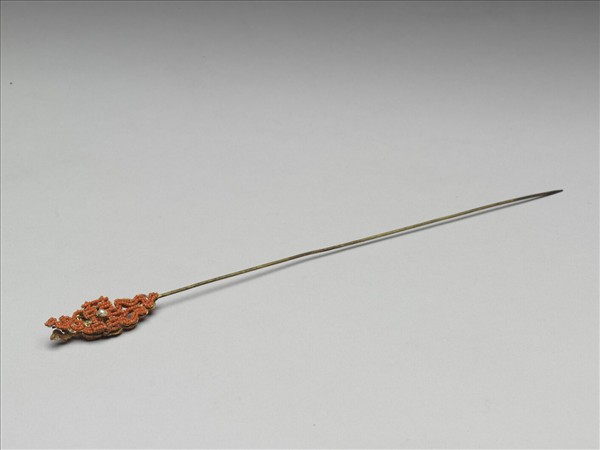 緝珠囍字簪,簪挺鍍金,簪首以珊瑚米珠緝出「囍」字,「囍」字兩旁復以珊瑚米珠緝為祥雲,「囍」字中央飾珍珠一顆,樣式充滿喜氣,作工精緻。