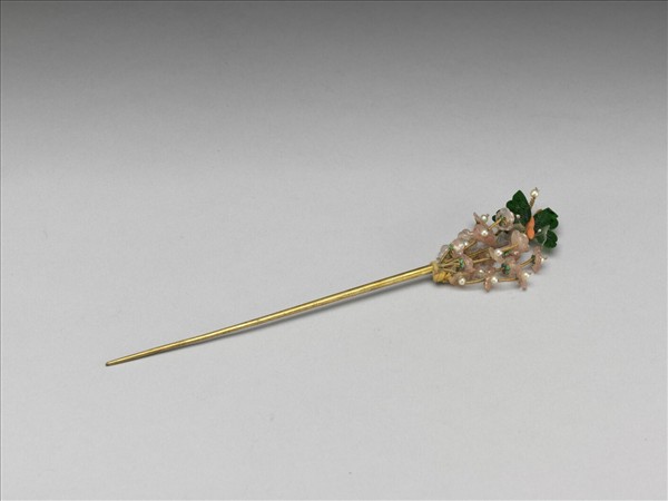 花蝶簪,簪首為一束粉紅碧璽梅花,頂端停一隻蝴蝶,有「喜福」之意。梅花以金屬彈簧為柄,加飾翠青花托,珍珠花心;蝴蝶以珊瑚為身,碧玉為翅,加飾纍絲珍珠觸鬚。圓鋌光素,尾端尖。