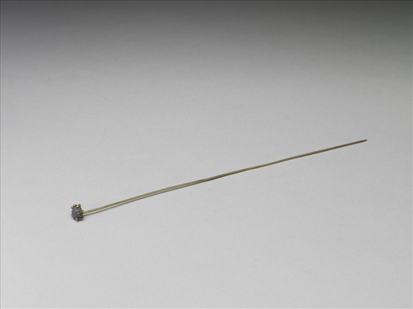 藍寶石簪,簪首以爪鑲法單鑲一顆藍寶石,細圓鋌光素,尾端尖。