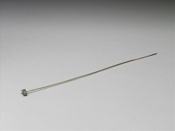 藍寶石簪,簪首以爪鑲法單鑲一顆藍寶石,細圓鋌光素,尾端尖。