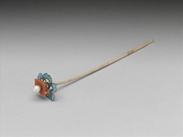 珊瑚囍字簪,簪首為一珊瑚囍字,上方鑲一顆珍珠,下方飾一圈點翠飄帶;圓鋌,以紙包覆。