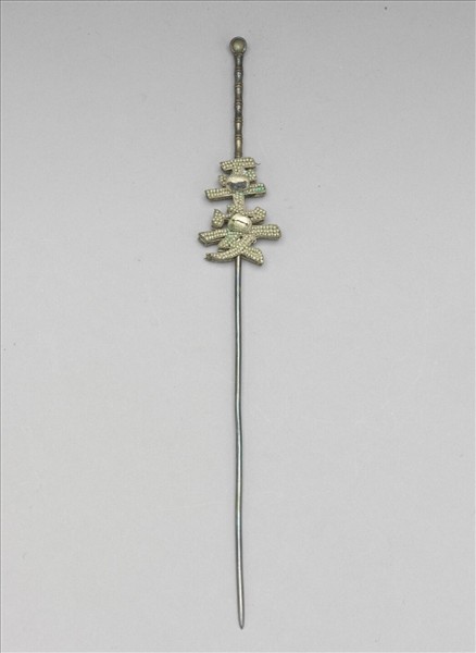 耳挖簪,簪首為竹節紋,頂端為一耳挖,下方雙面嵌珠「平安」二字,兩字中央有橢圓形嵌座,嵌件已失;圓挺光素,尾端尖。