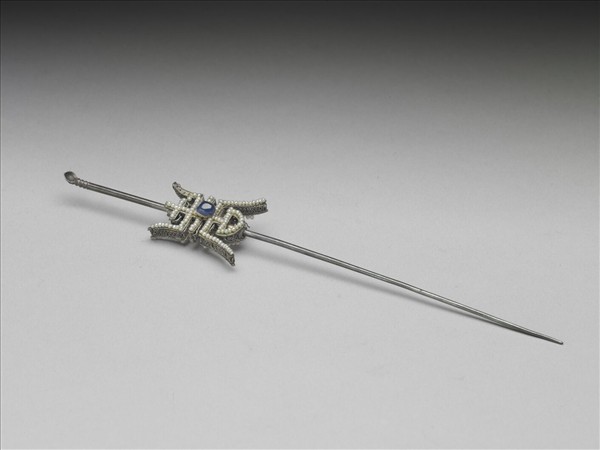 耳挖簪,簪首頂端為一耳挖,下方雙面嵌珠長形「壽」字,字中央嵌有一顆藍色寶石;圓鋌光素,尾端尖。