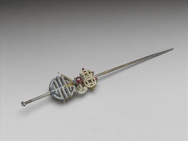耳挖簪,簪首頂端為一耳挖,下方飾嵌珠點翠團「壽」字,以紅寶石、珍珠、點翠拼成的蝙蝠,以及嵌珠雙錢紋,意寓「福壽雙全」;圓鋌光素,尾端尖。