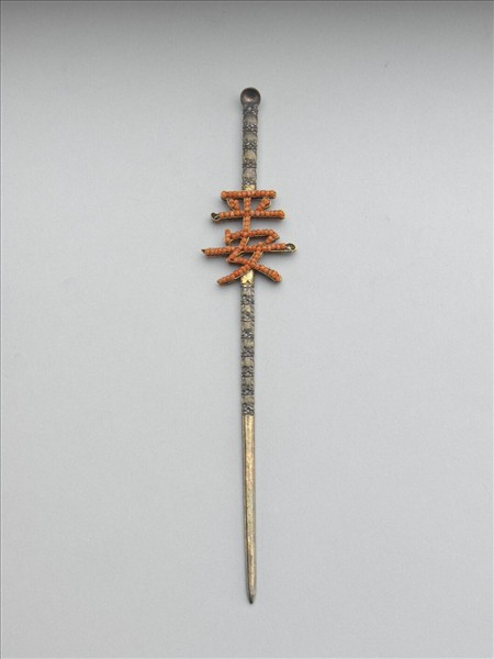 耳挖簪是一種長形髮簪,一頭如簪鋌長而尖細,一頭末端圓凹如耳挖,明清時期普遍流行,清代常與旗頭搭配。此件以銀鍍金製成簪形及文字形,再將珊瑚米珠串填入淺槽中,以文字為飾也是中國常用的手法。