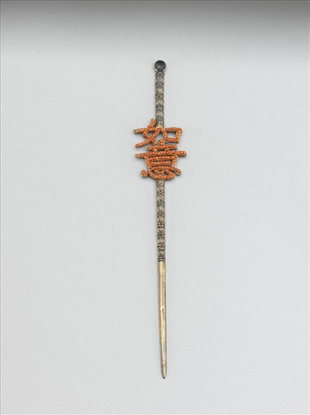 耳挖簪是一種長形髮簪,一頭如簪鋌長而尖細,一頭末端圓凹如耳挖,明清時期普遍流行,清代常與旗頭搭配。此件以銀鍍金製成簪形及文字形,再將珊瑚米珠串填入淺槽中,以文字為飾也是中國常用的手法。