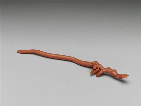 珊瑚花卉簪,由整支珊瑚做成,簪首浮雕樹木枝幹,並立雕花朵;簪挺維持珊瑚原本的形狀。