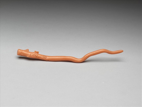 珊瑚松梅簪,由整支珊瑚做成,簪首浮雕松葉、枝幹及梅花;簪挺維持珊瑚原本的形狀。