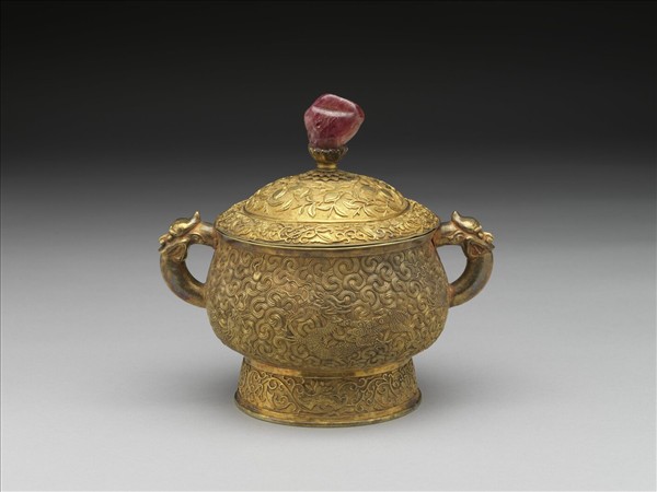 爐、瓶、盒和鏟、箸,為焚香時所需的成組器,爐為焚香之用,盒盛香木塊或香餅之用,箸用來夾香木塊,鏟則用來翻鏟爐中的香灰,箸與鏟是插在瓶內。此附蓋簋式爐,粉紅碧璽蓋鈕,蓋面飾桃實,周飾轉枝花葉;爐身兩側飾龍首耳,爐身於雲紋錦地間鏨兩組雙龍戲珠紋,圈足飾轉枝花葉。