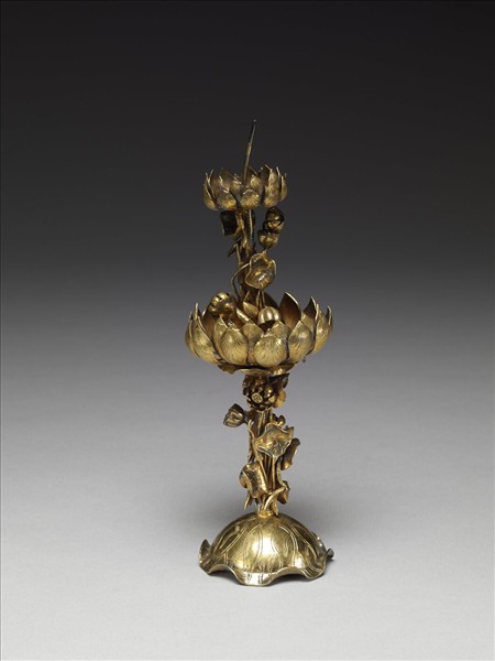 燭台,通體金黃,荷葉下覆為座,蓮花花葉與蓮蓬叢生而上,上盛開蓮花一朵,花心又叢生較小的蓮花直上盛開,花心出蠟阡。整器如大小兩束盛開蓮花組合成器,可見製作者的巧思。