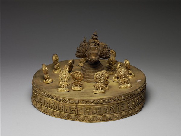 銅鍍金壇城,壇身周壁敲花雕飾梵文,梵文上緣飾花葉紋,下緣飾俯蓮瓣紋。壇面中央為七階盤級而上的須彌山,作山岳四方叢起狀,樓臺密佈;環山為兩圈的立體插飾,牌均敲花範製。外圈為八吉祥(法輪、幢傘、盤長、法螺、蓮花、寶罐、雙魚、寶蓋),內圈為七政寶(輪寶、象寶、馬寶、珠寶、玉女寶、財臣寶、武將寶)。