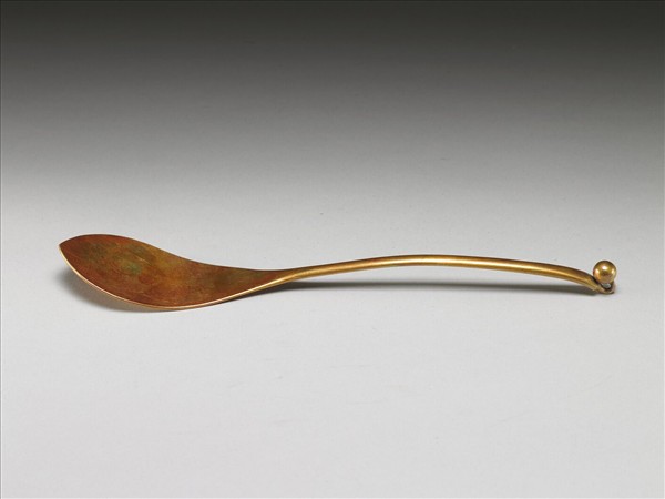銅質鍍金淺匙,橢圓形匙面,前端尖,弧形扁方柱形彎柄,匙尾有一彎折,上接金珠以為裝飾。匙柄背面有鏨刻「光緒元年(1875)原討領,二兩平八成金重三兩」十六字直向單行陰文款。