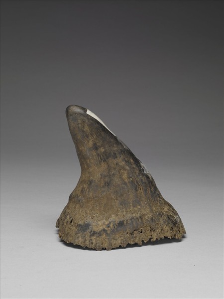 自犀牛身上取下後未曾加工的犀牛角,保持原有型態,自底面看,可知為實心的組織;犀牛角與牛羊的角不同,是皮膚的衍生物,如同人的指甲一樣,以角質類的成分居多。古代除中藥的藥用用途外,工藝上大多取其原形,挖空做成杯、觥之類的器形。