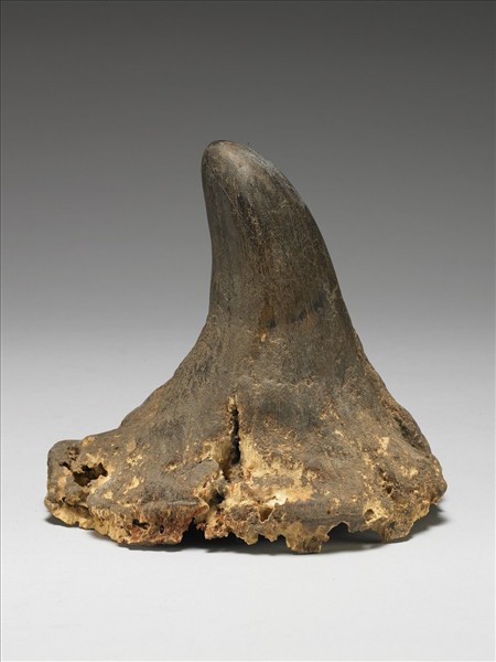 自犀牛身上取下後未曾加工的犀牛角,保持原有型態,自底面看,可知為實心的組織;犀牛角與牛羊的角不同,是皮膚的衍生物,如同人的指甲一樣,以角質類的成分居多。古代除中藥的藥用用途外,工藝上大多取其原形,挖空做成杯、觥之類的器形。