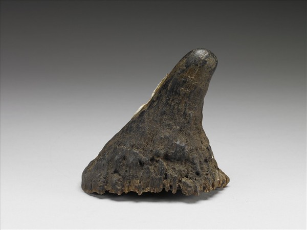 自犀牛身上取下後未曾加工的犀牛角,保持原有型態,自底面看,可知為實心的組織;犀牛角與牛羊的角不同,是皮膚的衍生物,如同人的指甲一樣,以角質類的成分居多。古代除中藥的藥用用途外,工藝上大多取其原形,挖空做成杯、觥之類的器形。