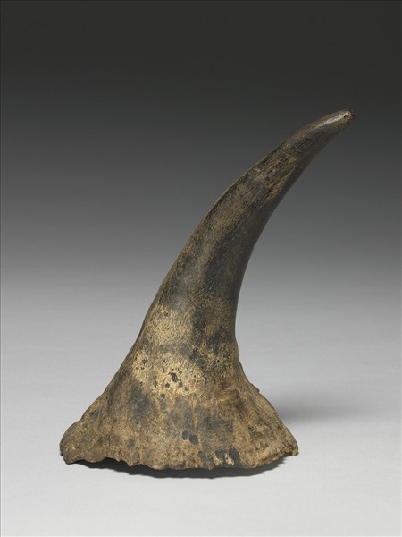 自犀牛身上取下後未曾加工的犀牛角,保持原有型態,自底面看,可知為實心的組織;犀牛角與牛羊的角不同,是皮膚的衍生物,如同人的指甲一樣,以角質類的成分居多。古代除中藥的藥用用途外,工藝上大多取其原形,挖空做成杯、觥之類的器形。