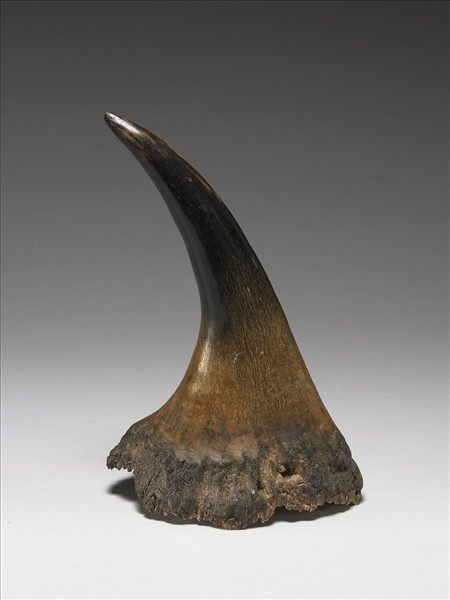 自犀牛身上取下後未曾加工的犀牛角,保持原有型態,自底面看,可知為實心的組織;犀牛角與牛羊的角不同,是皮膚的衍生物,如同人的指甲一樣,以角質類的成分居多。古代除中藥的藥用用途外,工藝上大多取其原形,挖空做成杯、觥之類的器形。