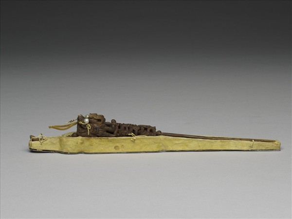檀香木素鋌耳挖簪,簪首雕為一龍,龍頭大而威猛,並以珍珠作雙眼。