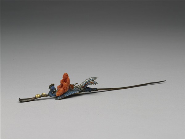 素鋌耳挖簪,簪首作仙人乘鳳樣式。仙人以整塊珊瑚雕成,就口吹奏樂器,衣袂飄飄,一派悠閒自在之貌。鳳凰則尾部揚起、展翅飛翔,滿身點翠襯以尾部的珍珠,更顯華貴。