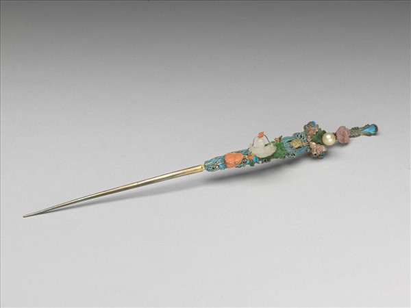 素鋌金屬簪。簪首作劉海戲蟾之式。略弧的金屬簪面,飾以亮藍的點翠,有如海面的波浪。白玉質仙人立於綠玉荷葉上,雙手舉起擺動彎曲的金屬線,線上有珊瑚環、碧玉飾,像是一件吸引人的珍寶。仙人面部下俯,望向下方的安靜如山的蟾蜍,像是逗弄、引誘蟾蜍的注意,動靜之間,充滿趣味。