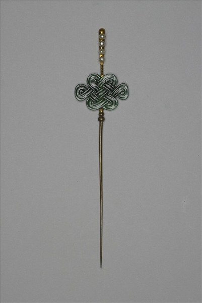 金屬素鋌耳挖簪。簪首嵌綠玉盤長片狀飾件,耳挖處嵌珍珠,樣式簡單,又流露出富貴之氣。