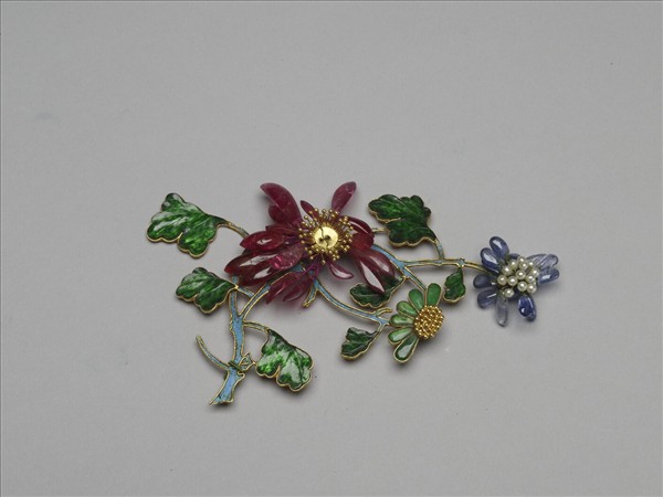 小飾件,以金屬錘鍱鏨刻為折枝花,綠色玉石作葉、花枝點翠,再加上紅藍二色碧璽為瓣的盛開花,亮麗繽紛,又透著富貴之氣。