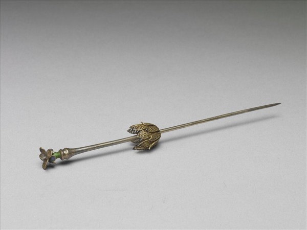 素鋌簪,簪鋌中段飾有花托,花托以細密鐵線作魚鱗地,製作甚精細。簪首亦作一盛開花,片狀的花瓣錯落有致。兩種不同製作方式的花朵,互相映襯,也增添整體視覺效果的豐富度。