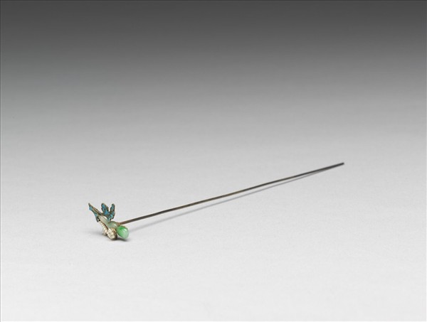 尖首素鋌簪。簪首以綠玉葫蘆為飾,葫蘆上以點翠裝飾的葉片崢嶸伸展,又葫蘆嫩鬚上又滿緝米珠,既華麗又具生意。