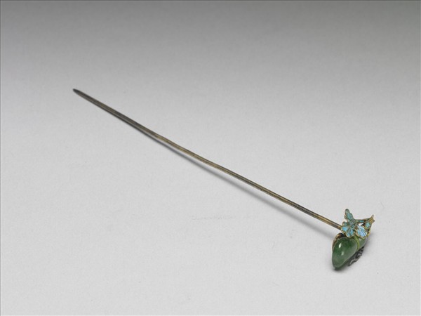尖首素鋌簪。簪首以玉葫蘆為飾,葫蘆上以點翠裝飾的葉片崢嶸伸展,又飾鐵絲彈簧以模擬葫蘆嫩鬚,更添生意。