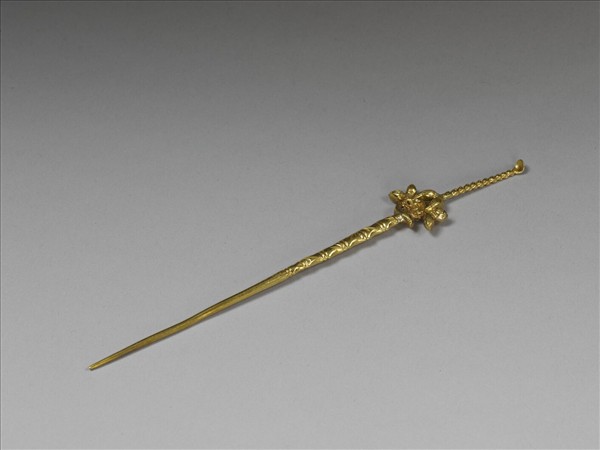 鍍金蓮花耳簪,簪首鑄成菱形節柱,首與鋌間鑄有花紋;直鋌,前端為竹節式,節上可見竹葉芽,刻畫細膩。