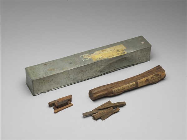 沉香木條,直木身,首尾平切,色深褐,木紋極細,木身黏有大小黃籤兩張。