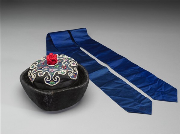 嵌珠石紅絨結頂皮帽