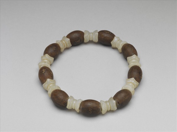 手串,以茄楠木雕刻而成之九顆橢圓珠組成,木珠間飾一道弦紋之白玉六角形珠。