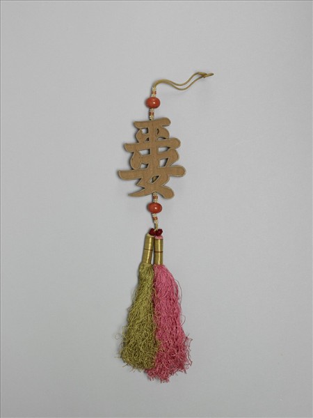 木香牌,鏤雕楷體平安二字,上下端繫珊瑚珠、珍珠及米珠,並飾結子及紅、綠色流蘇。