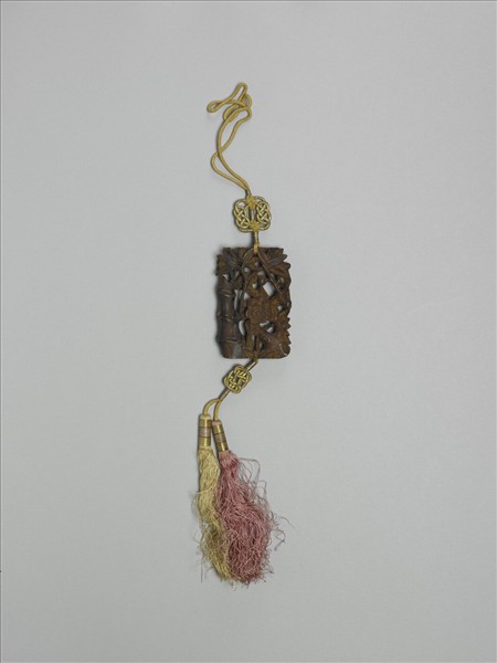 木珮,鏤雕一株竹及一株梅,具有「梅開五福,竹報三春」的吉祥寓意,上下端繫結子及粉紅、綠色流蘇。