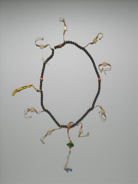 沉香木朝珠,間珊瑚佛頭,頂端有佛頭、佛頭塔,下串有綠玉魚,以藍色石為墜角,間飾碧璽、珍珠及珊瑚米珠。另綴有玉雕八吉祥墜飾,亦配飾珍珠及珊瑚米珠。