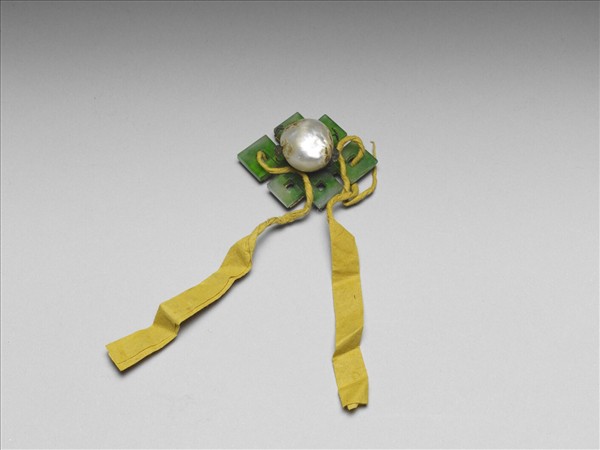 盤長帽花,翠玉雕盤長嵌於銅鍍金托,中央綴鑲一顆珍珠。托有四小環,可能有釦腳的功能,作為縫綴穿線之用。附漆盒一只。