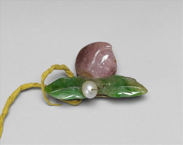 帽花,做壽桃造型,粉紅色碧璽琢成桃形,下配翠玉葉,葉上中央穿一珍珠,嵌於銅鍍金座上,造型可愛討喜;背後有圈環以供穿線縫綴。