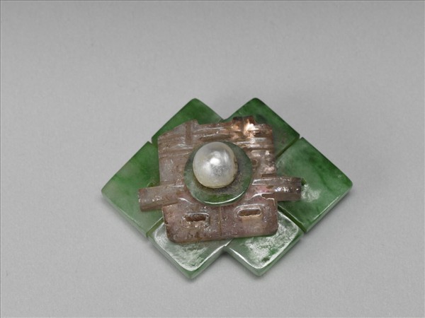 帽花,以方角盤長形碧玉、囍字粉紅碧璽、小碧玉片及珍珠由下至上層層堆疊組合而成。背面穿一橢圓形金片,上有圈環供穿線縫綴。