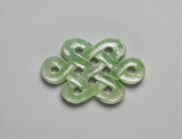 帽花,碧玉琢成圓角盤長形,中間孔洞較大,可穿線縫綴。