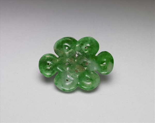 帽花,翠玉琢成圓角盤長形,中間孔洞較大,可穿線縫綴。