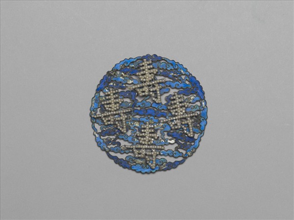 團形。銀絲座上飾深淺藍色點翠雲紋,四壽字座上嵌米珠。