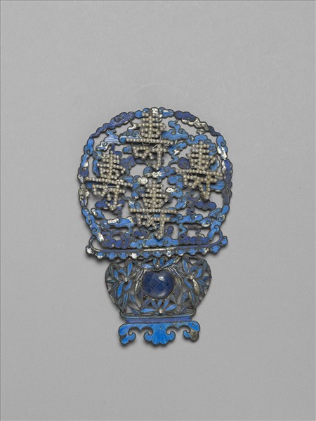 上部團形,銀絲座上飾藍、紫點翠,四壽字座上嵌米珠。下部花籃式,籃身飾竹葉紋,籃與竹葉飾藍、紫點翠。花籃正中嵌藍色寶石。