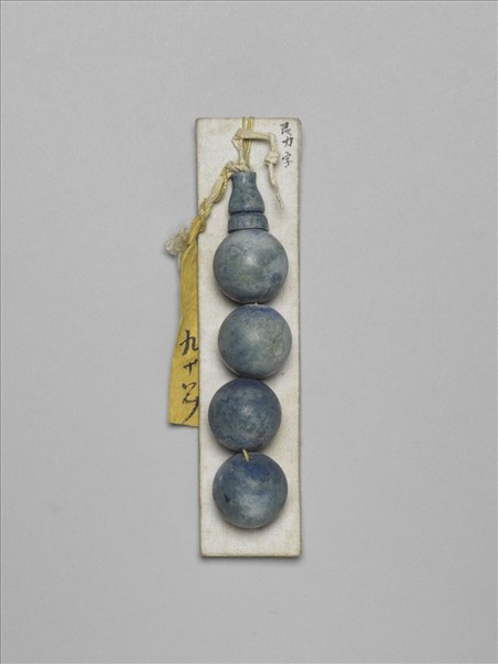 青金石質,圓形佛頭四顆,附一只佛頭塔,以絲線串繫固定於紙板上。器表呈深淺不一的灰青色,有網紋。佛頭為間隔整串朝珠的一種佩飾物件,尺寸較朝珠大,配置於上下左右各一枚,前三後一,多採用各類玉石或珊瑚、寶石製成。