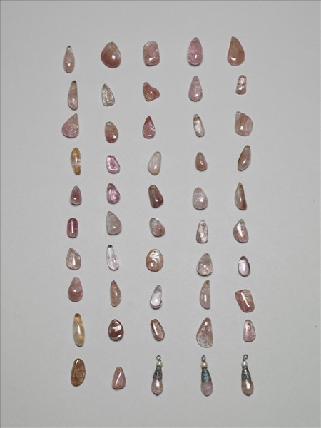 粉紅碧璽一堆,計大小五十塊,多琢成水滴塊狀,色澤深淺不一。部分料石尖端鑿穿一孔,其中有三粒碧璽已製成墜角,鑲有纍絲寶蓋。寶蓋飾壽字及雲紋點翠,上端纍絲作花瓣型座,嵌接小珍珠一粒。