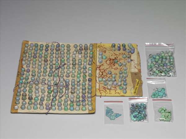 各式松石,呈湖綠色,琢成蓮瓣口式及鐘形捲邊荷葉式,面淺刻花瓣葉脈,另有琢成陰線蝴蝶式挑牌,共計大小四百零六個。其中,荷葉式寶蓋由紅色絲線排成十三行十七列,穿訂於大張紙板上,有二百二十一個。另一小紙板上存留四十三個,其餘散落者則按樣式成堆分裝成小包。可能做為配飾選材之用。