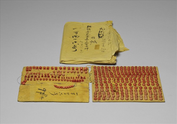 大小珊瑚寶蓋,呈橘紅色,琢成捲邊荷葉式及蓮花口式,按樣式別排成行列,以紅色絲線穿訂於兩張紙板上,共計三百零四顆。附黃色包裝紙,有墨書「珊瑚各式寶蓋三百十件 / 一百四十六號」。可能做為配飾選材之用。