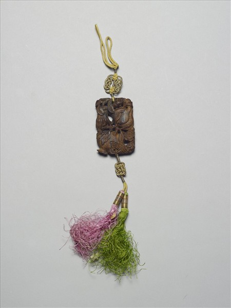 茄楠木雙面雕三多香佩,鏤雕佛手、桃實與石榴,象徵多福、多壽、多子。