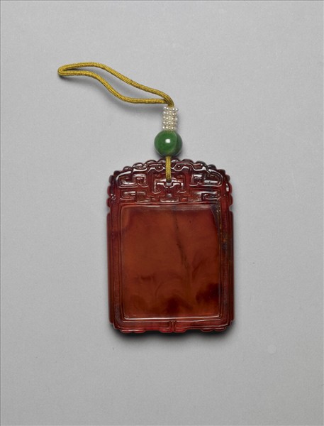 褐金色琥珀作長方形佩。佩雙面上方浮雕圖案式雙龍紋,中間光素,溫潤有光澤。器上方鑽孔繫黃縧,並貫飾一粒翠玉珠子,上緝白米珠。