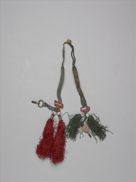 西洋懷錶銅鑰匙兩支,一以綠色織帶繫之,織帶上織有「出門見喜」紅字,下有粉色碧璽,繫飯塊珠及流蘇為飾。另一則同以綠織帶繫之,織帶織有「青平見□」字樣,以珊瑚雕竹節及兩側珊瑚、飯塊珠流蘇為飾。早期自西方傳入中國的懷錶,為需以鑰匙手動上弦(上發條)的機械錶款,隨身配戴時,其分開置放的上弦鑰匙容易散失,故常見以金屬錶鍊或織帶繫之。